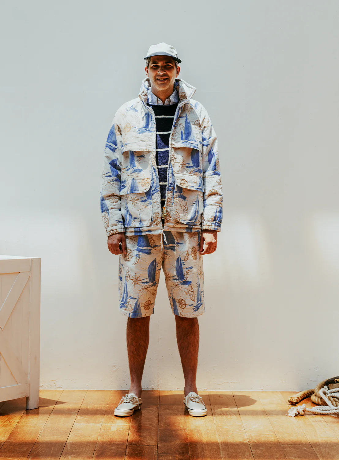 Quilted shorts featuring an all-over sailing map print with illustrated yachts and compass motifs. This standout piece channels vintage nautical aesthetics in a wearable silhouette. Pairs perfectly with the matching jacket or pants for coordinated styling.