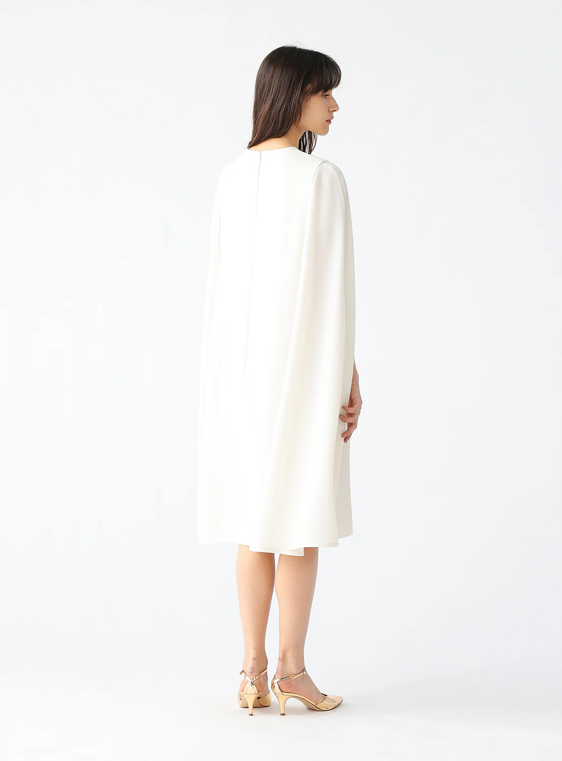 This elegant ivory cape dress delivers timeless sophistication with a modern edge. The clean silhouette is elevated by dramatic cape-style panels that drape gracefully from the shoulders, creating soft movement and a refined presence. The ivory tone enhances its minimalistic charm, making it ideal for formal occasions and evening events.
