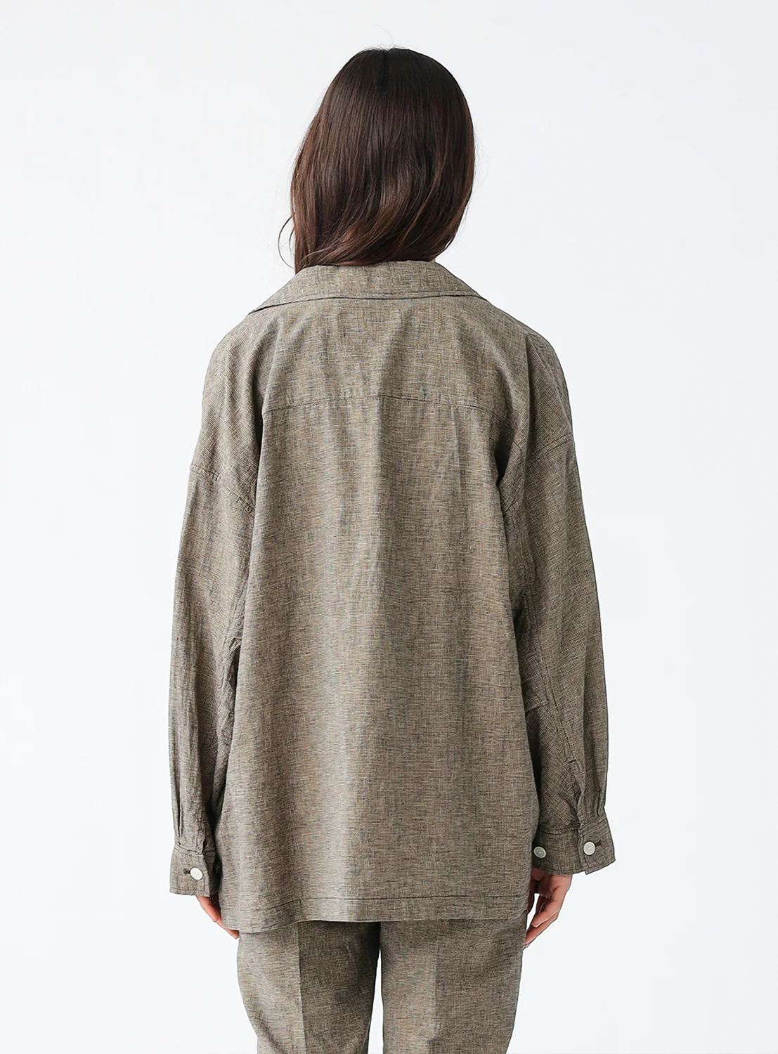 A lightweight jacket designed for a cool and effortless summer setup. Although it is technically a jacket, it features shirt-like details, allowing it to be worn casually with ease.